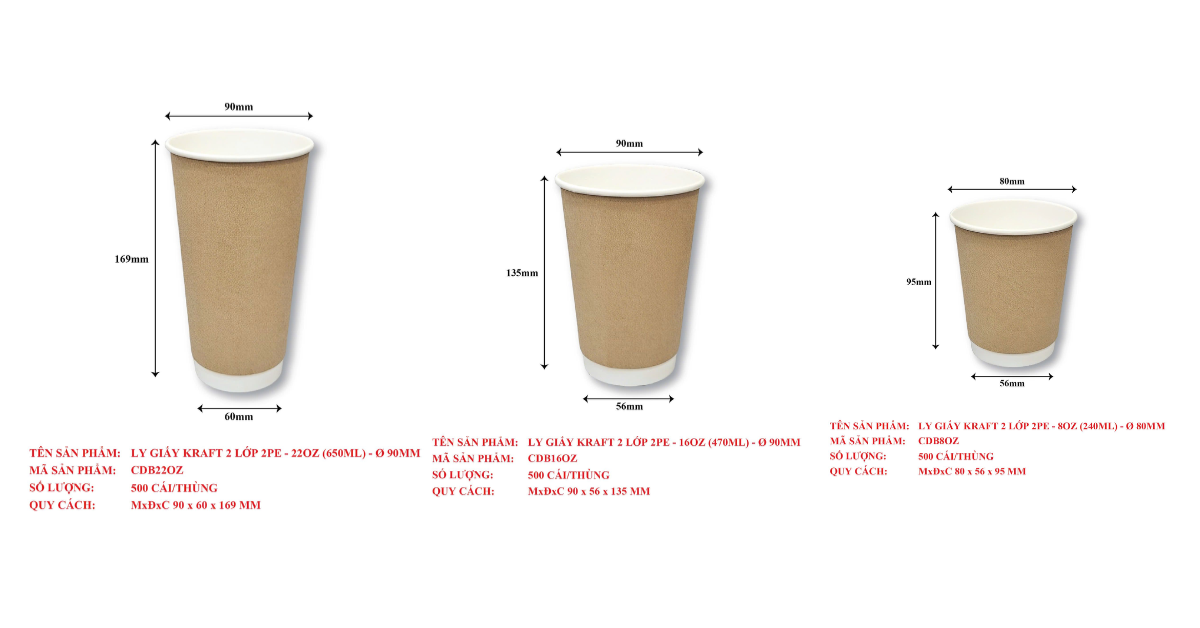 Ly Giấy Kraft 2 Lớp 2PE, 22OZ (650ML): Ly lớn, phù hợp cho các loại đồ uống nhiều đá hoặc thức uống cỡ lớn.
