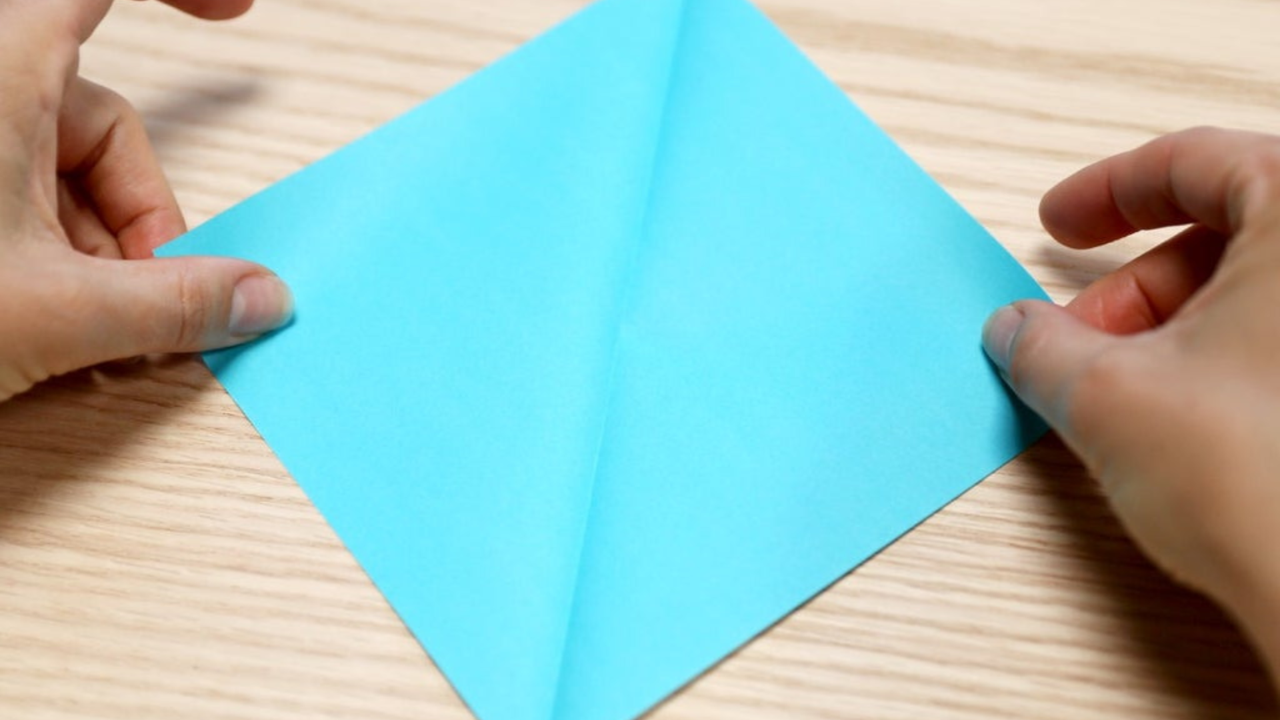 Đặt hình vuông lên mặt bàn. Gấp đôi hình vuông theo đường chéo thứ nhất, vuốt mạnh để tạo nếp rồi mở ra.